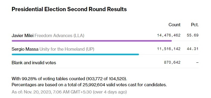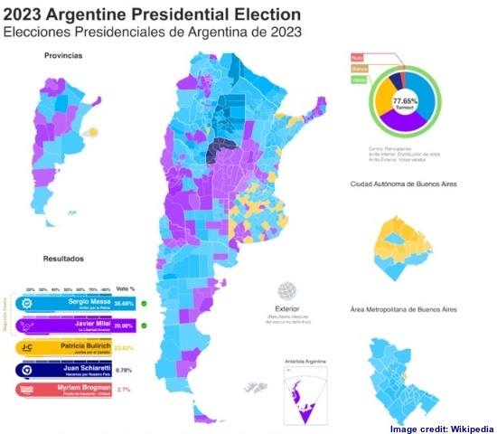 Libertarian extremist Javier Gerardo Milei of the Freedom Advances Party (LLA) registered a big win in Argentina’s November 19, 2023 run-off Presidential Elections, defeating Sergio Tomás Massa of the ruling Union for the Fatherland (UxP) coalition (56%-44%). This was a rout for Massa and represented a resounding condemnation of the Government of Alberto Fernandez, who failed to follow through on any of the promises he had made to rebuild the economy in 2019, after defeating the ultra-corrupt and pro-IMF President Mauricio Macri.