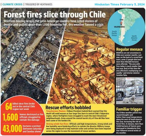 Unfortunately, wildfires have become a common phenomenon in Chile. The country has been experiencing wildfires during summer almost every year since 2017. In 2023, wildfires claimed 27 lives and destroyed 0.4 hectares of land. So far in 2024, 43,000 hectares of land have been destroyed. Most importantly, wildfires spread from 30,000 hectares to 43,000 hectares of land in just two days (February 2-3). The concerned authorities in Santiago believe that the severity is much higher this time. Many areas in Valparaíso were covered with thick black smoke on February 4. President Boric admitted that the situation was indeed alarming!
