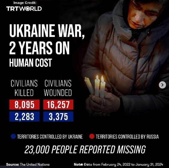 It was not supposed to take long for Russia to annex Ukraine, as President Vladimir Vladimirovich Putin believed that a few days might be enough for his Armed Forces to conclude the special military operation. He also believed that it would be a smooth operation just like the invasion of Crimea in 2014. The President expected that the Russian troops would occupy much of Ukraine and he would install a puppet Government in Kiev later! However, two years have passed since the Russian invasion of Ukraine on February 24, 2022, and the war has claimed the lives of many Russian, as well as Ukrainian, soldiers. Millions have also become homeless. While some have fled to other parts of their countries, others have taken shelter abroad as refugees.