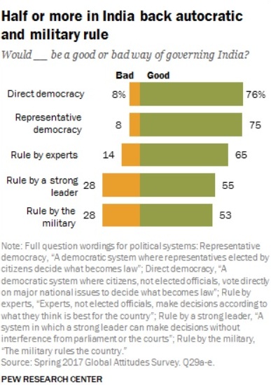 Further, 79% of Indians believe that a democratic system with elected representatives is a good way of governing. Moreover, 80% of Indians support a direct democracy and 82% support a technocracy, believing that experts instead of elected officials should make decisions.