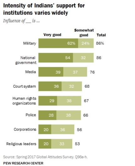 As per the survey, around 67% of Indians support a system where a strong leader can make decisions without interference from the Parliament or the Judiciary. Additionally, 72% of Indians support military rule in the country.