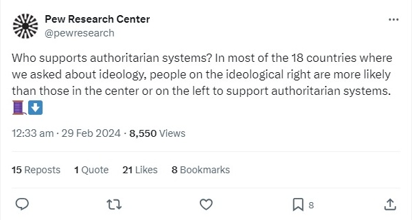 In its latest survey, Pew Research Centre has revealed that around 85% of Indians support an authoritarian system! The Washington DC-based nonpartisan think-tank conducted the survey among 30,861 people in 24 countries from February 20 to May 22, 2023.