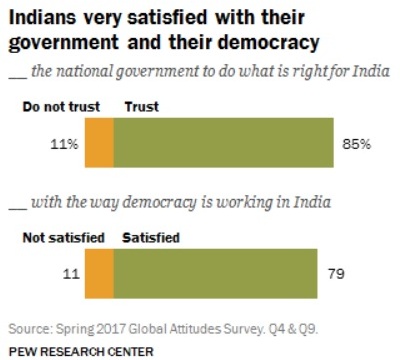 While ratings for democracy are generally negative across all surveyed countries, with 59% expressing dissatisfaction with how democracy is working in their country, India is an exception. Over 72% of Indians expressed satisfaction with the way democracy operates in the South Asian country.