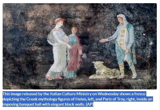 The high black-walled dining hall had been buried under solidified lava and thick ash for 1,945 years! During recent excavations, dazzling frescoes emerged at the Roman city of Pompeii. The magnificent works of unknown artists of 2,000 years ago would leave one stunned. The Italian Ministry of Culture issued a statement on April 10, 2024, mentioning that one of the frescoes depicts the Greek mythological figures of Helen and Paris of Troy that was discovered inside the imposing banquet hall with elegant black walls.