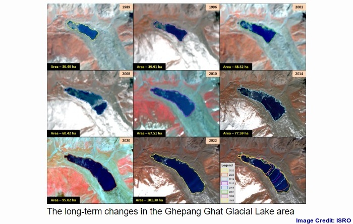 Scientists are worried about this development. Renowned Glaciologist Anil V Kulkarni has stated: “Scientists, including our team, have already highlighted that Gepang Gaht lake has expanded at a major scale and can potentially affect the Manali-Leh Highway and population downstream. We have already recommended that Provincial Governments take precautionary action.” He further said that the Government of India should also focus on lakes beyond the country’s borders, stressing: “We need to negotiate and discuss these lakes with neighbouring countries.” Referring to the Lhonak lage GLOF in Sikkim as a case in point, the glaciologist said that the Indian Institute of Science (IISc) presented an assessment of current and future GLOF hazard for Gepang Gath Lake in 2023, factoring in the prospect of rock and/or ice avalanches cascading into the lake. The ISRO has claimed that the Himalayan region is a quite sensitive one. Along with huge glaciers, many places in this region are covered with snow. Hence, Climate Change has a serious impact here.