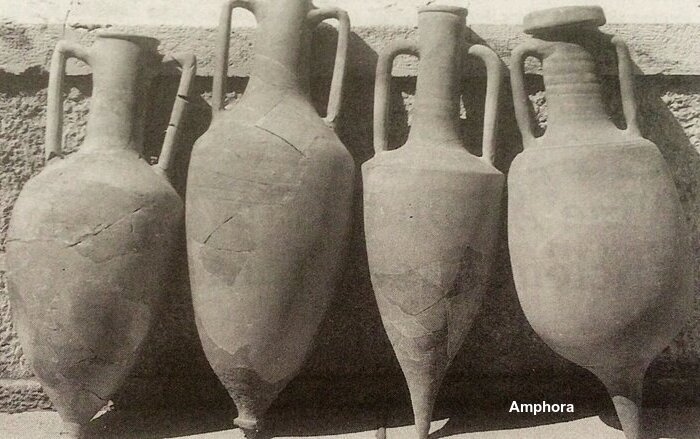 Amphora is a type of container with a pointed bottom, and characteristic shape and size that fit tightly against each other in storage rooms and packages, tied together with rope and delivered by land or sea. The size and shape of an amphora have been determined from at least as early as the Neolithic Period. Amphoras were used in ancient Greece mainly to store wine, milk or grain. This type of jars had one handle each on two sides.