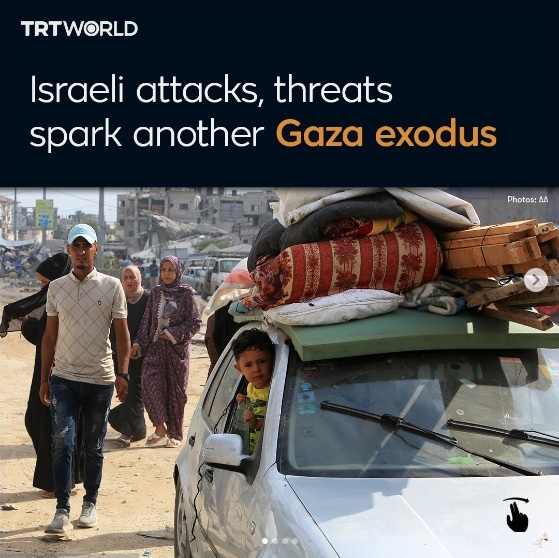 (TRT World) Riding donkey carts or bicycles or on foot, thousands of Palestinians fled their tents, temporary refuges and homes in Gaza on July 8, 2024 after Israel issued a third threat, warning the enclave’s residents to leave or suffer the consequences amid the Israeli Army’s intense and ongoing shelling and bombardment.