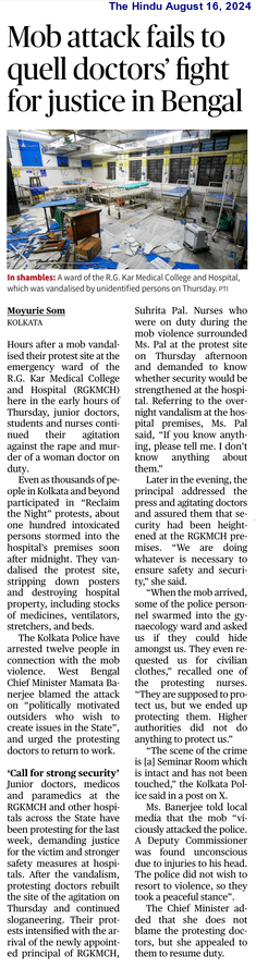 The Guardian reported that as “the marchers made their way past homes, gated communities and apartment blocks, many inside rushed out to join the throng, undeterred by the rain” in Kolkata. The chants were about justice, safety and respect. Anupama Chakraborty, who came out with her two granddaughters (aged 11 and 13), told The Telegraph: “This has rocked the country. The girl who was brutalised was an on-duty doctor. If the Government cannot ensure the safety of women at a Government-run institution, what hope is there?”