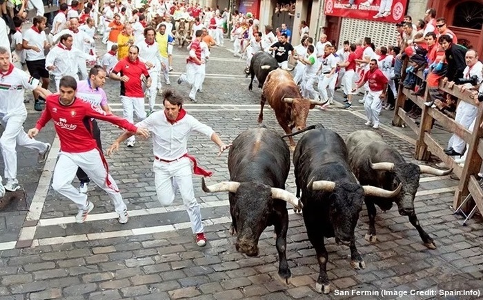 The festival of San Fermín (running of the bulls) is a week-long, traditional celebration held annually in Pamplona from July 6 to July 14 every year. The main attraction of this festival lies in a 930-yard street, from Santo Domingo Street to the Plaza de Toros de Las Ventas (known simply as Las Ventas, the largest bullfighting ring in Spain). One can notice exuberance among the people who voluntarily run with the bulls. Over the course of time, San Fermín has become a unique Fiesta that attracts tourists from different parts of the globe.