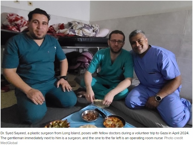 While in New York, Dr Sayeed took part in Anti-Israel protests, calling members of the US Congress to put the Joe Biden Administration under pressure (in order to snap defence ties with the Jewish Nation). Later, he decided to help the injured Gazans in crisis period and contacted the voluntary organisation MedGlobal that was sending doctors, surgeons, health workers and volunteers to Gaza. Dr Sayeed informed the press that MedGlobal had sent him to Latin America and Tanzania in the past. However, he was a member of the medical mission in those places during peace time. Now, he is serving people in a war zone!