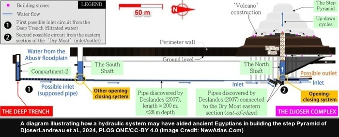 Although Egyptologists have been trying hard to reveal the construction process of ancient pyramids for years, the exact methods used to build those marvels of engineering remain shrouded in mystery despite centuries of scrutiny. In an article published in the PLOS One journal in August 2024, researchers mentioned that water had played an important role in the construction process, saying that the ancient Egyptians might have used a hydraulic system to lift huge stones into a place from the very heart of the Step Pyramid of Djoser. They stated: “Ancient Egyptians are famous for their pioneering and mastery of hydraulics through canals for irrigation purposes and barges to transport huge stones. This work opens a new line of research: the use of hydraulic force to erect the massive structures built by Pharaohs.”