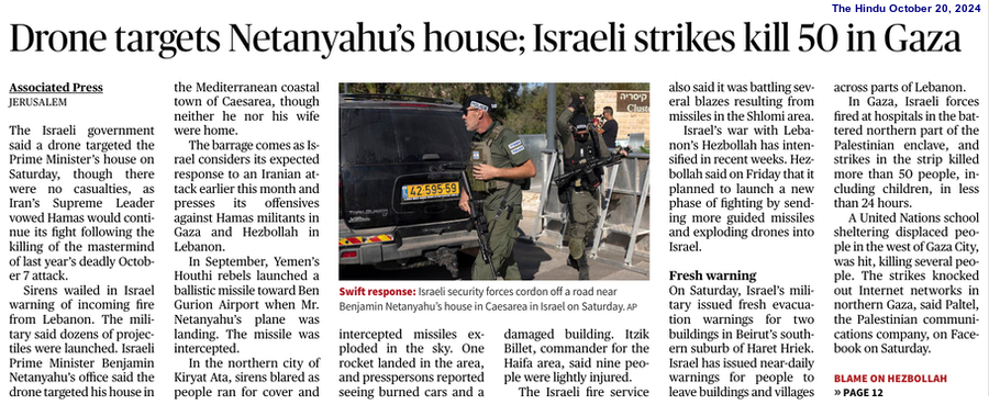 Meanwhile, missiles were fired at the official residence of Israeli Prime Minister Benjamin ‘Bibi’ Netanyahu on October 19. Neither PM Netanyahu nor his wife was there when the missiles landed near their residence in the Mediterranean coastal town of Caesarea from Lebanon! The Israeli media reported that a missile got stuck in a house in Caesarea and exploded, although no one died.