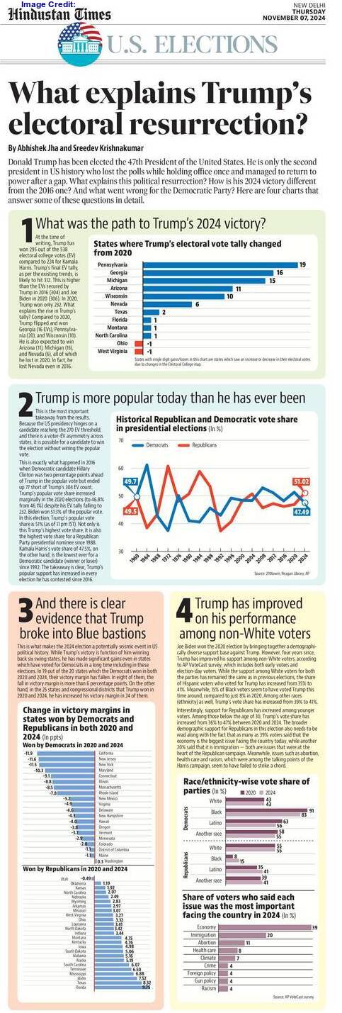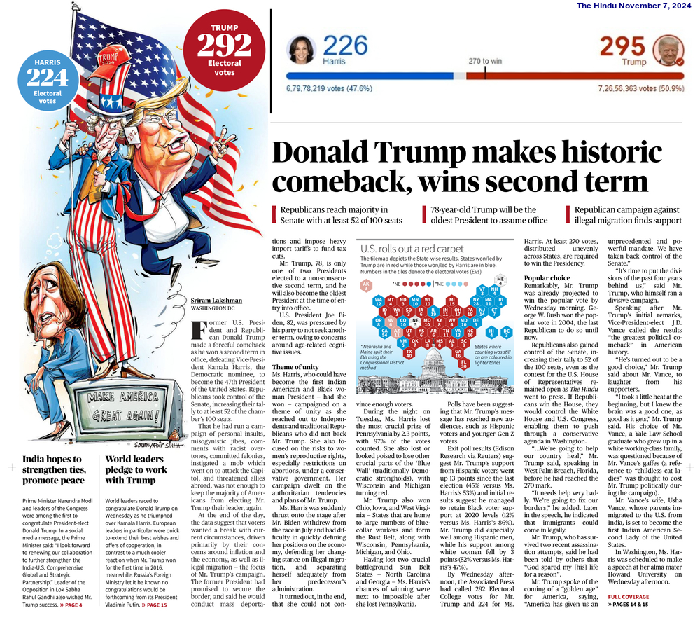 In such a scenario, many believe that Trump, reckless by nature, can bring the situation (in Israel and Ukraine) under control. A number of voters also kept in mind the old equation of Trump with Russian President Vladimir Vladimirovich Putin and relied on his ‘Make America Great Again‘ slogan. In addition, a section of the US citizens, fearful of Islamic fundamentalism, has tacitly supported Trump’s controversial comments! Significantly, a segment of Arab-Americans, upset with the Biden Administration‘s Israel policies, voted in favour of Trump this time, although they are traditionally known as supporters of the Democratic Party.