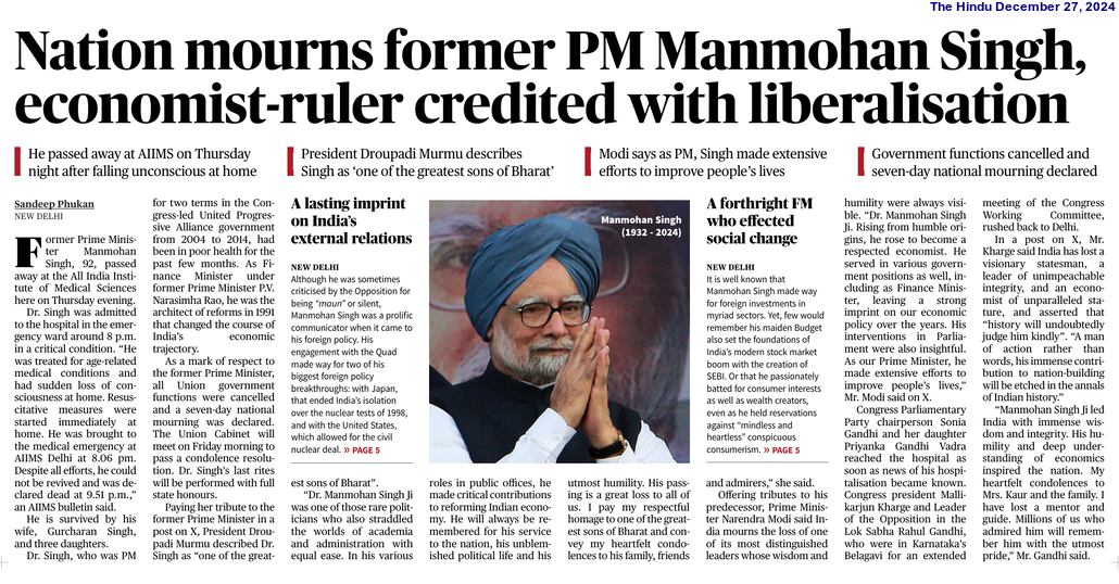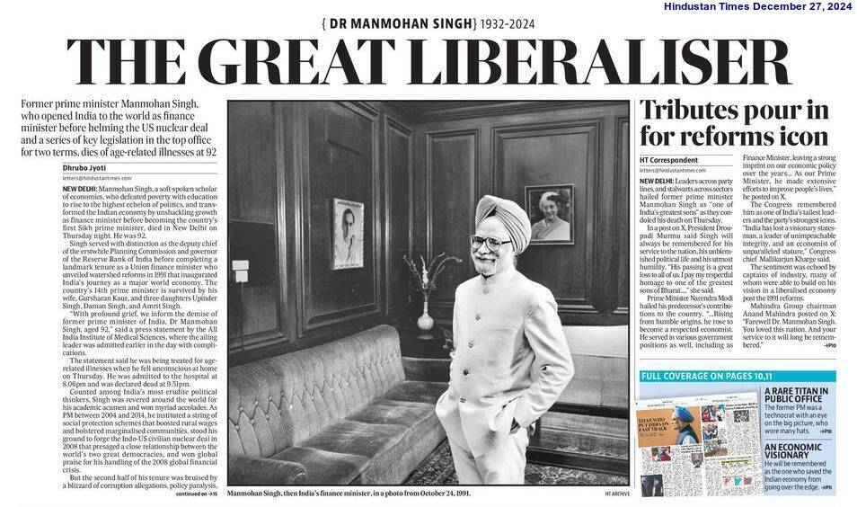 Dr Manmohan Singh (September 26, 1932 – December 26, 2024), who served as the 13th Prime Minister of India from 2004 to 2014, passed away on December 26, 2024 at the age of 92. The fourth longest-serving Prime Minister of India (after Pandit Jawaharlal Nehru, Indira Gandhi and Narendra Modi) was an eminent economist, sharp minded and also an extremely honest person with utmost integrity. He is popularly known as the chief architect of India’s most important economic reform programme. Economic reforms had taken place from 1991 to 1993 that put the Indian economy in the orbit of global markets. The significance of the reform programme can be understood from the way India’s economic growth rate increased in the post-reform phase.