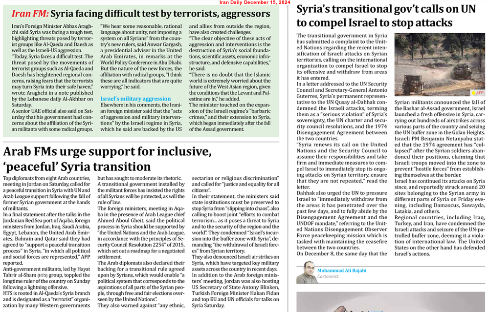 On the other hand, external powers continue to influence Syria even after its liberation from colonial rule almost eight decades ago! Although Russia has withdrawn forces from its military bases in Syria, Moscow is concerned about the existence of the US naval and air bases there. President-elect Donald John Trump has claimed that the US is not interested in Syria and in its internal issues! However, opportunistic Israel has repeatedly attacked chemical and other arsenal sites to weaken the Syrian defence strength. The Zionist Regime has taken control of the demilitarised zone of the Golan Heights, ignoring the advice of the UN.