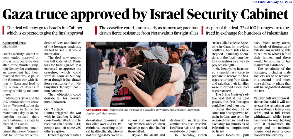 Initially, it has been decided that Hamas shall release 33 Israeli prisoners for now and the rest shall be released at a later stage. In exchange, Israel shall release 1,000 captured and imprisoned Palestinians. Tel Aviv has also agreed to allow the relief materials and humanitarian assistance to enter Gaza without which residents of the Palestinian territory could not survive. Reports suggest that the injured Palestinians may visit Egypt to receive medical treatment through the Rafah Border Crossing, the sole travel crossing of the Palestinian territory.