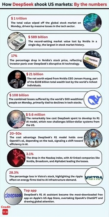 A tremor in the Artificial Intelligence (AI) trading market was felt across the globe on January 27, 2025. DeepSeek, a Chinese startup that recently unveiled a revolutionary AI model, wiped off USD 1 trillion from the Nasdaq’s market value, sending shockwaves through the Wall Street. This is the biggest fall of the US Stock Market in a single day that also disrupted the global markets. The US companies that have dominated the AI market so far are OpenAI, Meta, Google and, of course, Nvidia (in terms of AI hardware). Compared to them, DeepSeek, which debuted in May 2023, was insignificant (in terms of market capital or size).