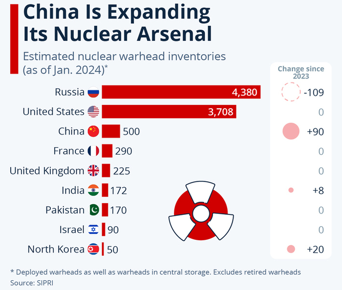 The Chinese defence researchers are currently working on hypersonic missiles and Artificial Intelligence (AI) technology for military purposes. The Asian powerhouse is also increasing the number of its nuclear warheads. As per the latest data released by the Stockholm International Peace Research Institute (SIPRI), China had an estimated 500 nuclear warheads as of January 2024. Meanwhile, the US has 5,044 nuclear warheads as of February 2025, while Russia has 5,580. The US Defence Department has assessed that China has a total of 600 nuclear warheads as of December 2024 and, if it remains on its current trajectory, Beijing may have up to 1,000 deliverable nuclear warheads by 2030. At the same time, Beijing is expanding its fleet of nuclear-powered and nuclear-armed submarines, apart from building drone-carrying warships.