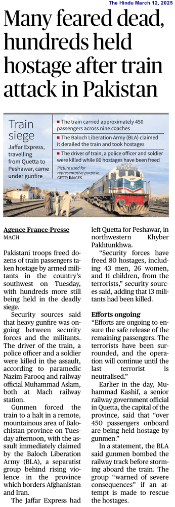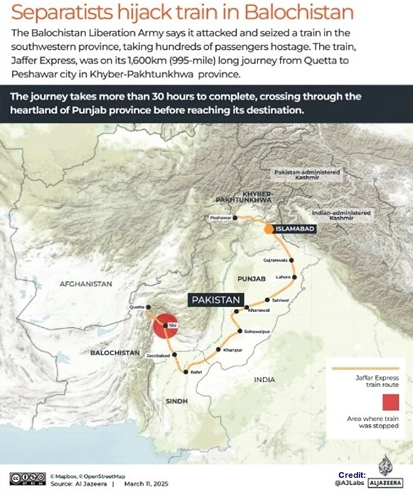 The Balochistan Liberation Army (BLA) hijacked a train, the Jaffar Express, in Bolan on March 11, 2025 and took hundreds of people hostage as the train was travelling from Quetta to Peshawar. The Pakistani Army managed to rescue 104 passengers on March 12, with the Army and the Baloch rebels engaging in a gunfight. It may be noted that the Baloch rebels have repeatedly targeted this particular train in recent times.