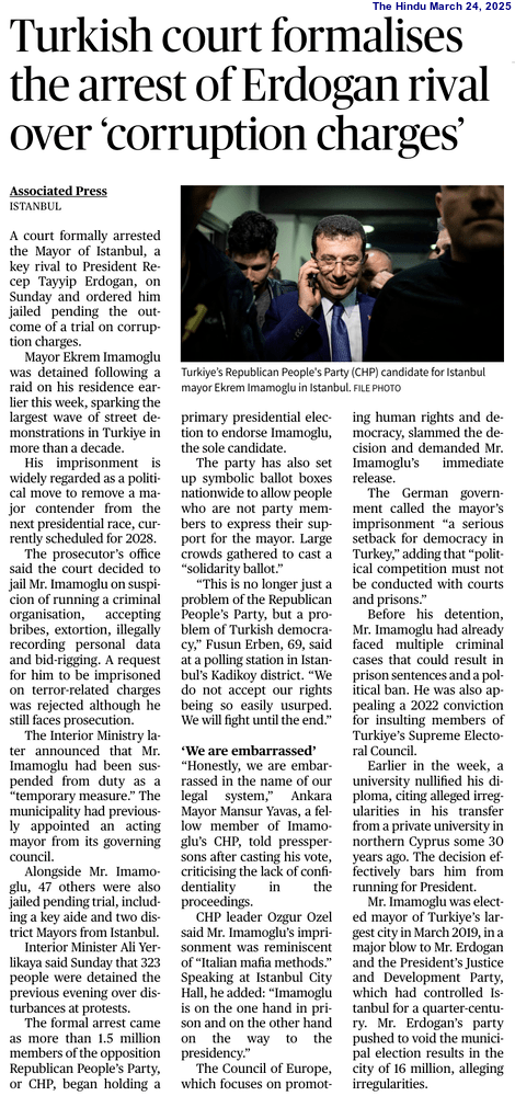 According to analysts, President Erdoğan has influenced the judiciary to get İmamoğlu detained as the CHP has nominated the latter as its presidential candidate. Meanwhile, the CHP has decided to intensify the protests, with Mayor of Ankara Mansur Yavaş stating that the imprisonment of İmamoğlu is a disgrace to the judicial system.