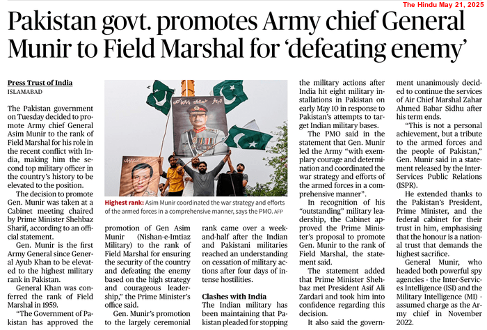 In may be noted that General Ayub Khan promoted himself to the rank of Field Marshal after seizing power in a bloodless military coup in 1958. However, General Munir is the first officer in the history of the Pakistani Army to be promoted to the rank of Field Marshal by an elected civilian government.