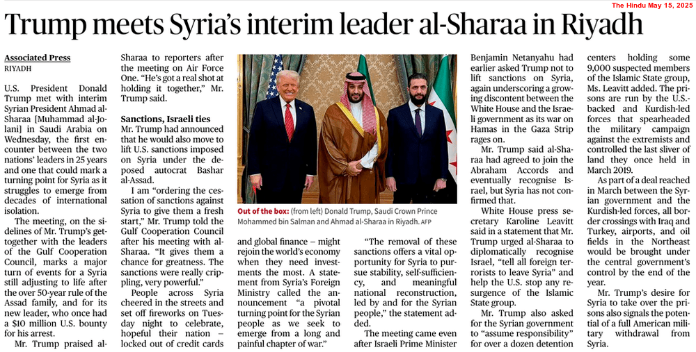 In a separate development, President Trump met Interim President of Syria Ahmed Hussein al-Sharaa (also known by his nom de guerre Abu Mohammad al-Julani) during his recent visit to Saudi Arabia. It may be noted that the US scrapped a USD 10 million reward for the arrest of the Syrian de facto leader in December 2024, following meetings between senior US diplomats and representatives from Hayat Tahrir al-Sham (HTS), a Sunni Islamist political organisation and paramilitary group involved in the Syrian civil war that ousted former President Bashar al-Assad.