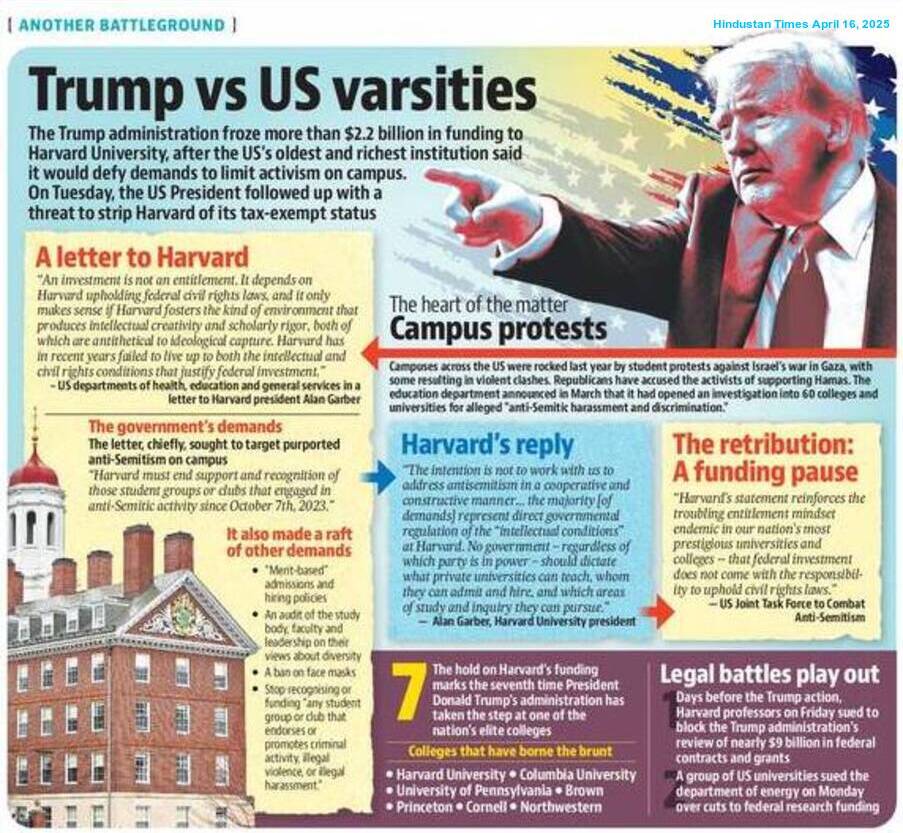 The Conservatives are of the opinion that the prestigious US universities have become the epicentre of Ultra-Liberal Progressivism. They have alleged that the high-paid professors conduct research on incomprehensible subjects there, apart from teaching progressive lessons to the children of wealthy, highly-educated families. Hence, students stage protests on issues, such as racism, gender politics, Palestinian Statehood, etc., at those universities throughout the year. Ever since the protests over the Gaza War in 2024, Republican lawmakers have been threatening to cut off federal funding to universities if they were unable to stop anti-Israel rhetoric on their campuses and to punish protesters. Almost immediately after Trump became the 47th US President, Columbia University received a notice in which it was clearly mentioned that the university would not receive federal funding for research until anti-Israel protests stop. Although Columbia University has decided to follow the government order, Harvard University has refused to accept it, stressing that the government has no right to dictate terms and conditions of a private university. Then, President Trump has threatened to impose income tax on Harvard University, apart from cancelling visas of foreign students and researchers in an attempt to send them back to their countries.