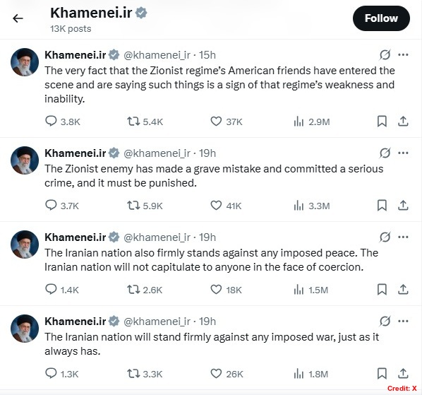 The US President was asked on June 17 whether he would really attack Iran. Trump kept the global community guessing about US military action against Iran, stating: “I may do it. I may not do it. I mean, nobody knows what I’m going to do.” On June 18, Khamenei issued a warning to Israel on X, saying: “The battle begins.“