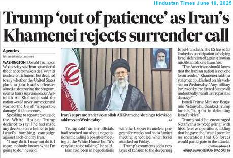 On June 17 (2025), President Trump launched verbal attacks on Supreme Iranian leader Ayatollah Ali Hosseini Khamenei, stressing: “We know exactly where the so-called ‘Supreme Leader’ is hiding. He is an easy target, but is safe there. We are not going to take him out (kill), at least not for now.” He also said: “But we don’t want missiles shot at civilians, or American soldiers. Our patience is wearing thin.“