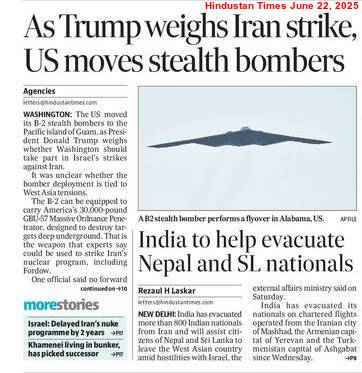 Reuters reported that the US dropped at least six Bunker Buster bombs (also known as the GBU-57 series Massive Ordnance Penetrator (MOP)) on Fordow nuclear facility from the Northrop B-2 Spirit aircraft. The Stealth Bomber is capable of carrying 15 tonnes of bombs and of performing attack missions at altitudes of up to 50,000 feet.