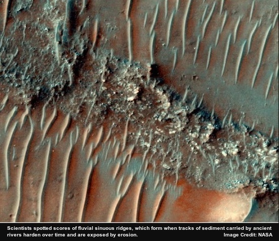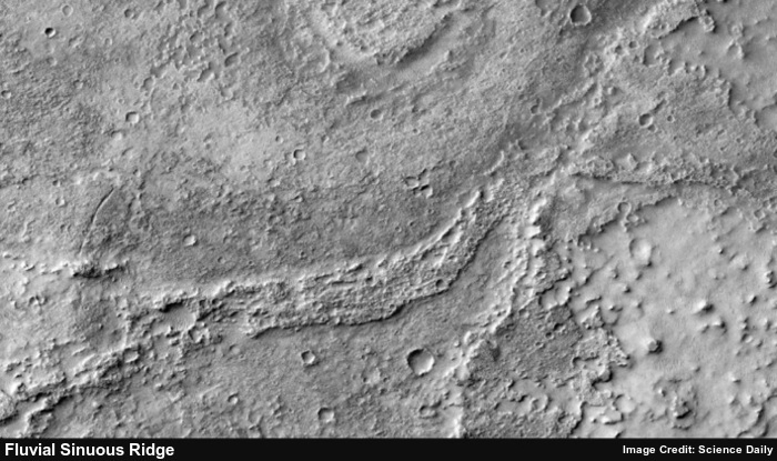 The MRO and the MGS have found evidence of a special type of geological feature, called Fluvial Sinuous Ridge (FSR), with lots of small craters in it, standing out clearly above the surrounding material. These are also called inverted channels. The FSRs are geological formations that result from the hardening (or lithification) of ancient river sediments, effectively creating ridges that mirror the winding paths of those past river channels. The ridges become exposed when the soft soil erodes, providing valuable insights into ancient fluvial systems both on Earth and Mars.