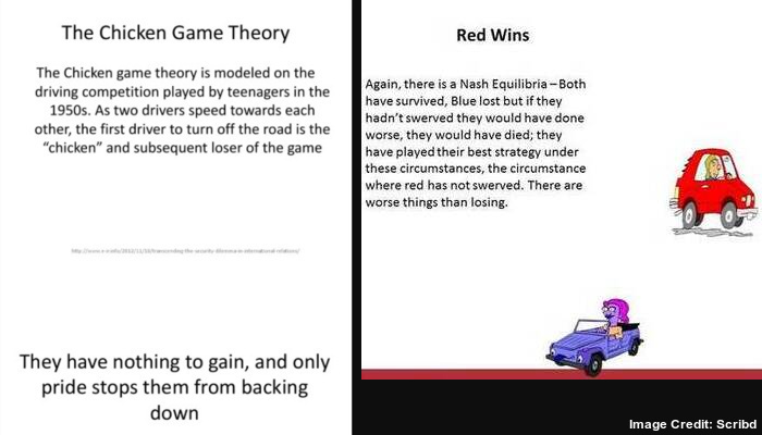 Although the term Taco has become a popular one across the globe, the description of this game is completely wrong in this particular case. The Chicken Game, as described in the textbooks, involves two players or teams, each with two strategies or choices. Let’s assume that the two strategies are aggressive action (attack) and non-violent response (remain peaceful). In case of Tariff Wars, the strategy should be to impose or not to impose tariffs on foreign products. And, leaders of the two countries will decide what they will do. The condition of this game is that they have to choose any particular strategy at the same time. It may be noted that Chicken Game is a classic example in Game Theory where the optimal strategy of each player depends on what the other player does.