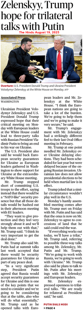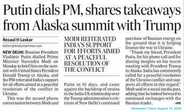 It may be noted that Russia launched drone attacks on four Ukrainian cities, killing at least 12 people, ahead of the Trump-Zelenskyy meeting in Washington DC on August 18. An entire family, including a toddler and a 16-year-old, were among seven people killed in the overnight drone strike on a residential neighbourhood in the northeastern city of Kharkiv. The attack also injured 20 people, including six children. Later, President Zelenskyy wrote on X: “Putin will commit demonstrative killings to maintain pressure on Ukraine and Europe, as well as to humiliate diplomatic efforts.”