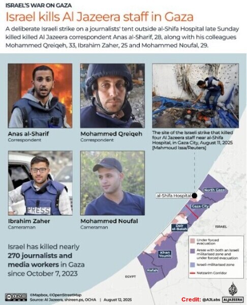George Bernard Shaw (July 26, 1856 – November 2, 1950) once said: “Murder is the ultimate form of censorship.” The global community experienced this truth, yet again, when Anas Jamal Mahmoud Al-Sharif (December 3, 1996 – August 10, 2025), a Palestinian journalist and videographer for Al Jazeera Arabic who was known for his frontline reporting from northern Gaza during the Gaza War, was killed, along with four journalists and two others, in an Israeli airstrike targeting them in a tent outside the Al-Shifa Hospital in Gaza City on August 10, 2025. At the time of his death, 234 journalists had been killed during the Gaza War.