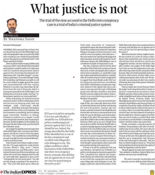 I happen to have some personal knowledge of this case, especially about two of the accused who I knew and worked with during the anti-CAA protests. Anyone who has known, watched or heard Umar Khalid knows that he does not have a communal bone in his body. He was an ideologue and ambassador-at-large of the anti-CAA movement, mostly away from Delhi in the months of January and February 2020, and at an arm’s length from the protests in Delhi. Similarly, Khalid Saifi, as an activist equally popular among Hindus and Muslims in his East Delhi locality, was among those most concerned that the protest should not take any confrontationist, let alone violent, turn. I cannot imagine them being remotely involved in any communal violence. I am sure this holds true of other accused as well, though I cannot speak in their cases with personal knowledge and experience.