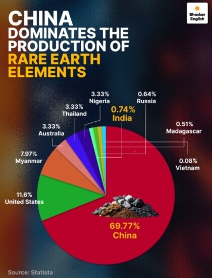 It may be noted that the Rare Earth Minerals are essential for electric vehicles, wind turbines, defence systems and various modern electronic gadgets because of their unique magnetic, as well as phosphorescent, properties. Although the raw geological availability of Rare Earth Minerals is spread globally, China has achieved dominance in this sector through early investments in refining technology, large-scale operations and a focus on value-added processing over primary extraction. The Asian Giant has leveraged lower labour costs and less stringent environmental regulations to build its processing capacity, thus making its operations the most cost-efficient. It allows China to control the supply of refined REEs. Currently, China controls 60-70% of global REE production, 85% of processing and 85-90% of REE refining.