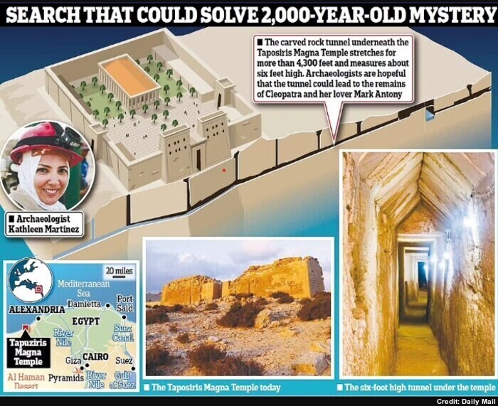 Martinez and her team have been trying to find the tomb of Cleopatra since 2005. Based on local information, they began searching for the tomb in New Borg El Arab, a new Egyptian city of the first generation located in Alexandria Governorate and administratively affiliated to the New Urban Communities Authority. This is the city where the Nile River meets the Mediterranean Sea. The archaeological team discovered a 1.5km-long tunnel deep inside the Taposiris Magna temple in 2022. After excavating the tunnel that merges with the sea, they found gold, several busts, and coins engraved with images of Cleopatra and the Ptolemies.