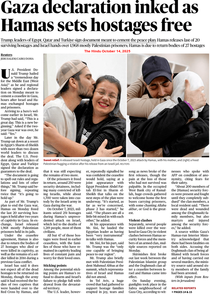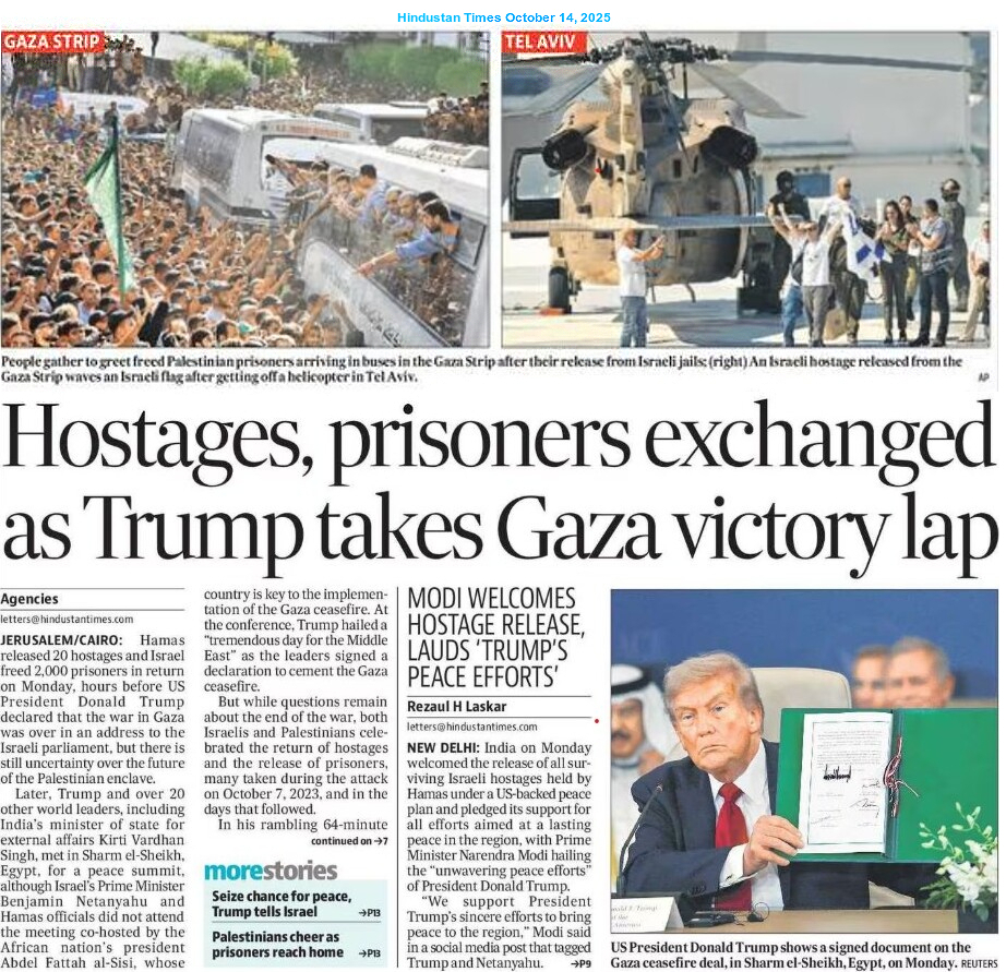 Shortly after the hostage-prisoner exchange, US President Donald John Trump arrived in Tel Aviv and addressed the Israeli Parliament. He also visited a hospital to meet some of the freed hostages. Later, the US President left for Egypt to attend the Gaza Peace Summit, aimed at ending the two-year-long war in the Gaza Strip. President Trump and his Egyptian counterpart Abdel Fattah al-Sisi co-hosted the summit in Sharm el-Sheikh.