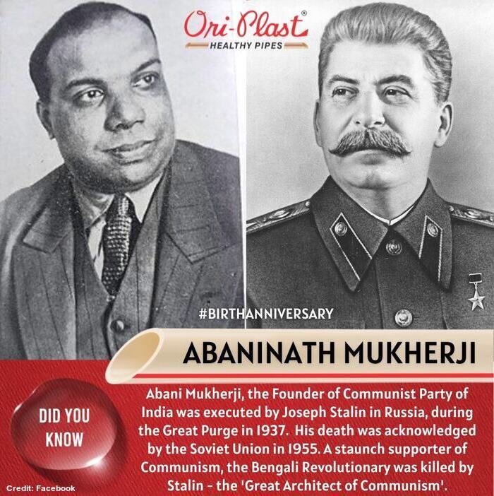 Abaninath Mukherji, jointly with M N Roy, founded the Communist Party of India in Tashkent on October 17, 1920 and also arranged military training for expatriate Indians at the Russian Military Academy in Baku. He was then nominated as a member of the Russian Communist Party and participated in the Third Congress of the Communist International in Moscow in 1921 as a delegate of the Bolshevik Party. After holding talks with the visiting revolutionaries from India at the end of that event, Abani decided to return home.