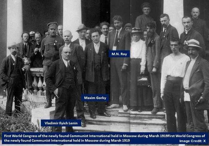 Abani arrived in Russia to attend the Second Congress of the Communist International in 1920. On the sidelines of this event in Petrograd, he met Vladimir Ilyich (Ulyanov) Lenin. With the help of M N Roy and his wife Evelyn Trent, he presented the Charter of the Communist Party of India in Petrograd. Then, Abani attended the Peoples of the East Conference in Baku as a representative from India.