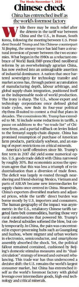 US President Donald John Trump‘s recent stance toward China reflects this principle. President Trump and his Chinese counterpart Xi Jinping made an attempt to stabilise bilateral relations during their meeting on the sidelines of the Asia-Pacific Economic Cooperation (APEC) Summit in Busan, South Korea on October 31 – November 1, 2025. After their “amazing” meeting, the US President claimed that Beijing agreed to purchase tremendous amounts of soybean from Washington DC, apart from expanding bilateral agricultural trade. He also announced that the US would reduce tariffs on Chinese goods from 57% to 47%.