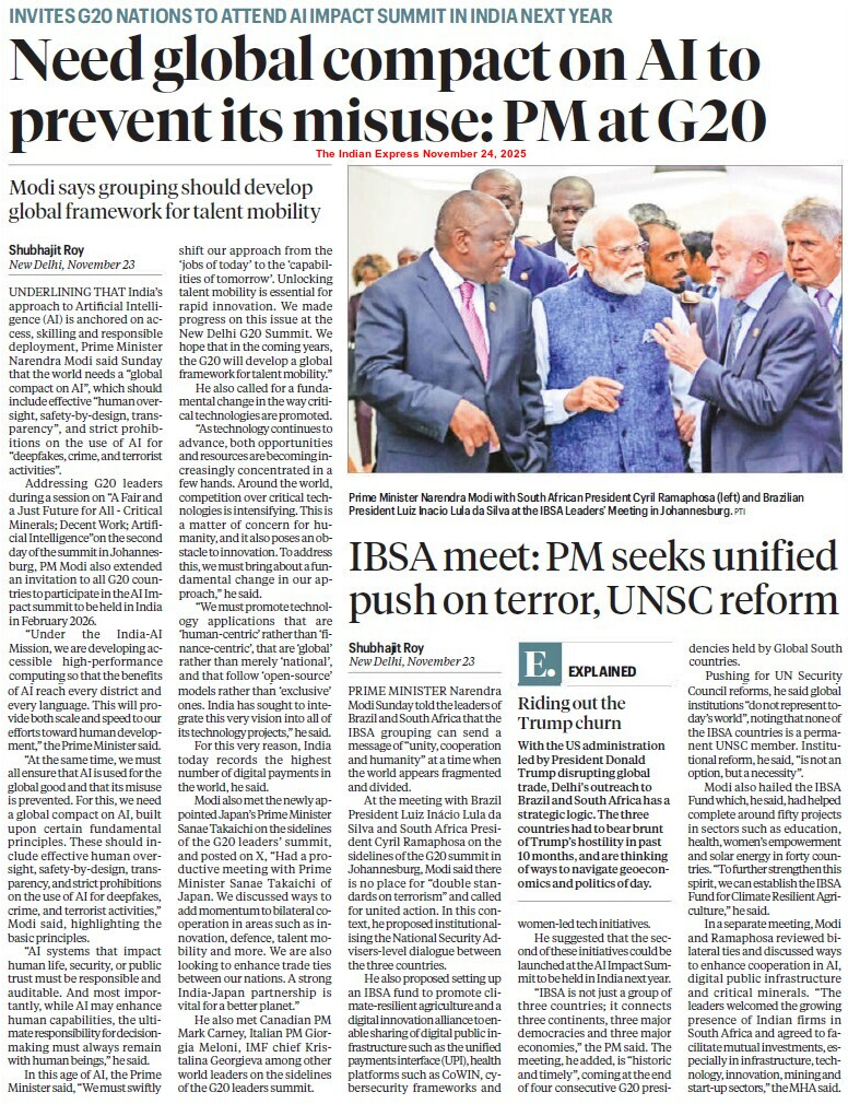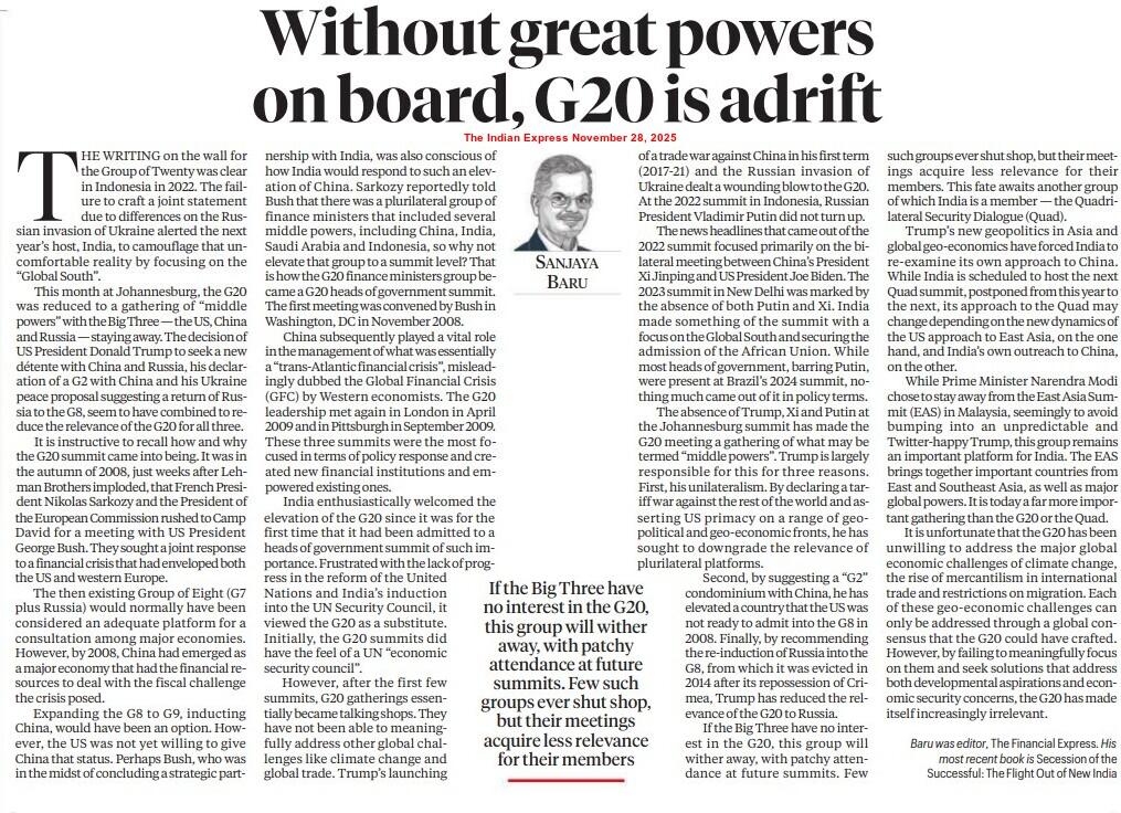 The recently-held G20 Summit in Johannesburg was an exceptional event for various reasons. In a rare first, an African nation hosted the summit. Secondly, the US did not attend the summit because of its diplomatic rift with the host country. And most importantly, world leaders from the Group of 20 rich and developing economies broke the tradition to adopt a declaration at the beginning of the summit (instead of the end) in South Africa on November 22, 2025.