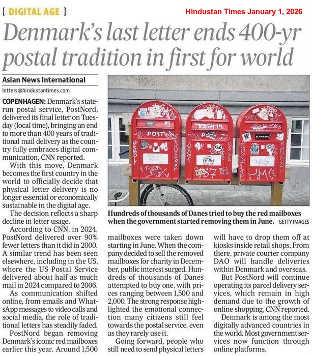 The local media reported that Denmark ended its postal service on December 30, 2025 after delivering the final letter. With this, roughly 1,500 mailboxes throughout the north-western European country were taken down and an estimated 1,500 of PostNord’s 4,600 employees were decided to be laid off. In a statement, PostNord has mentioned that citizens no longer rely on the postal system, except for parcel delivery. Also, they no longer write letters to their loved ones. At the same time, official correspondence is now entirely dependent on the internet system. Therefore, the agency has decided to upgrade itself by improving its parcel services, considering a huge hike in online shopping in the country.