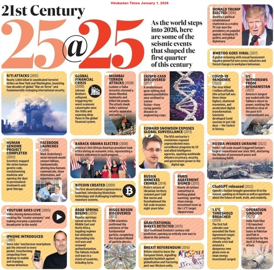 The first quarter of the 21st Century ended with the conclusion of the Year 2025. Twenty-five years (2001-25) is not a very long time, but merely a brief flicker when viewed against the backdrop of endless time (keeping in mind the vast difference between human perception of time and the concept of eternity in a philosophical sense). However, there are ample reasons to revisit this period precisely because it is the 21st Century. In fact, the conclusion of the Year 2025 marked 25 years of significant global shifts, including the rise of China, technological booms (like Artificial Intelligence) and major cultural moments.