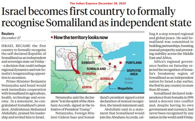 Now, Israel has become the first country to formally establish diplomatic relations with Somaliland. A statement issued by Benjamin ‘Bibi’ Netanyahu‘s Office stated: “Our Prime Minister announced the formal recognition of the Republic of Somaliland as an independent and sovereign state on December 26, 2025.” As per the statement, Israel and Somaliland had signed a joint declaration, establishing full diplomatic relations, “in the spirit of the Abraham Accords”, a set of deals brokered by the US to establish formal ties between Israel and Arab Nations.
