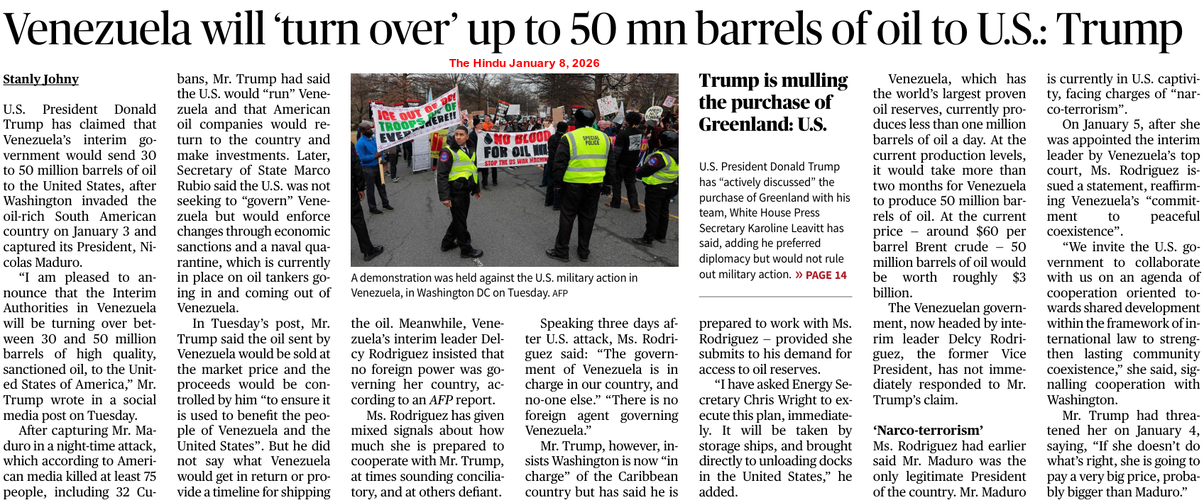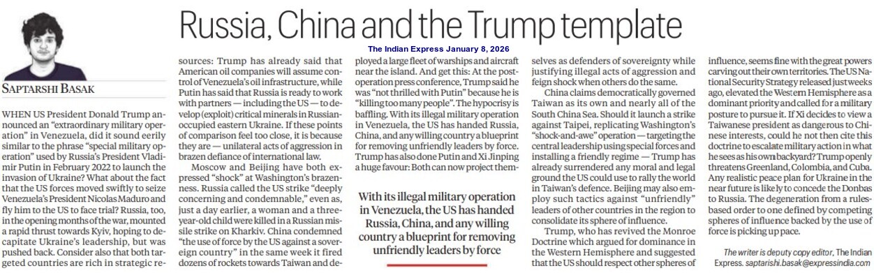 This is how the Global Diplomacy of the third decade of the 21st Century is being shaped. The abduction of the Venezuelan President in a military operation suggests the US’ return to a Might makes Right approach or Military Authoritarianism in International Relations. It also shows that the Trump Administration has prioritised national interests (economic and security) over strict adherence to international norms, treaties and institutions, indicating a shift towards a more transactional America First foreign policy rather than consistent multilateralism.