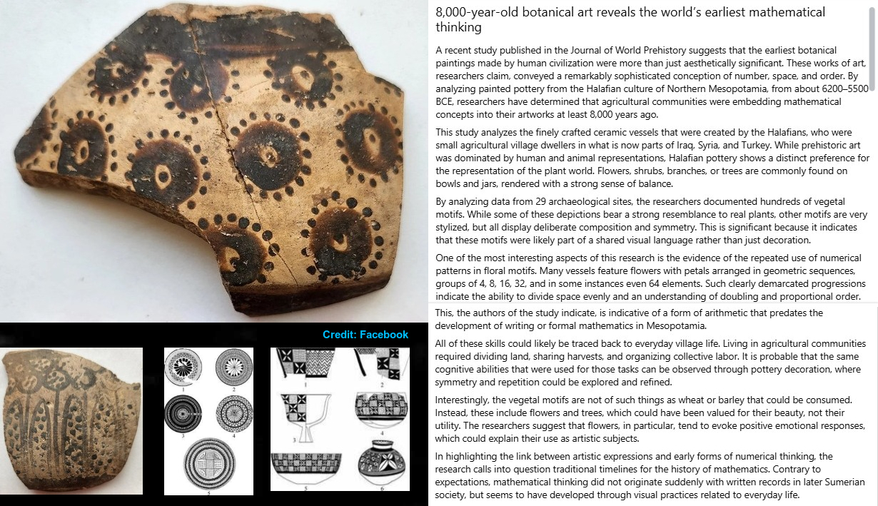 According to the study authors, it is difficult to know how much mathematical ability prehistoric communities had without the existence of written evidence. However, the discovery and analysis of the vegetal decoration of Halafian pottery vessels “enables some understanding of these aspects“. Professor Krulwich has mentioned in a statement: “These patterns show that mathematical thinking began long before writing. People visualised divisions, sequences and balance through their art.” She believes the Halafians were using these concepts in their daily lives, such as for “sharing harvests or allocating communal fields“.