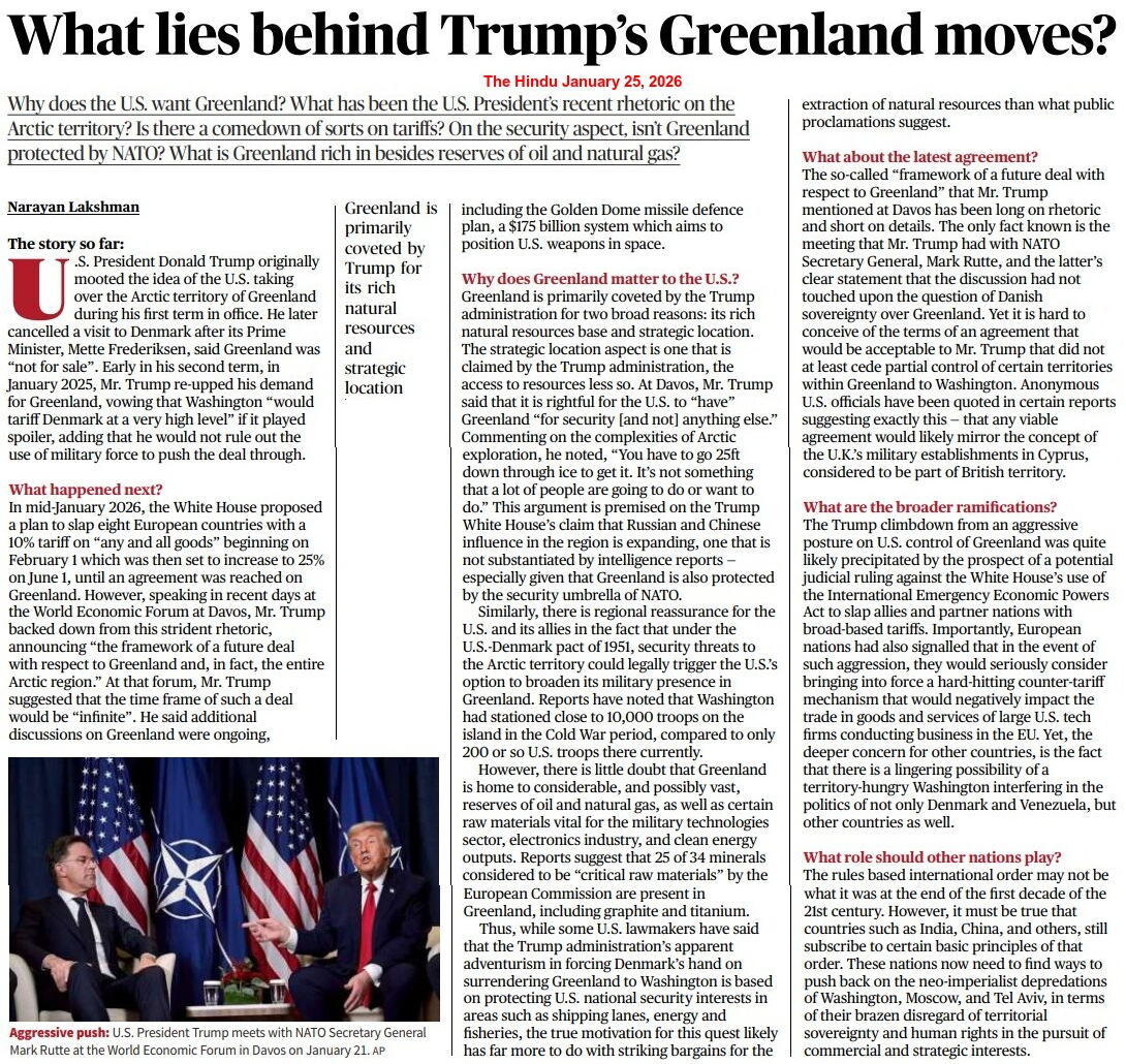 In this context, President Trump’s message at the World Economic Forum (WEF) in Davos on January 23, 2026 is noteworthy. The US President stated that he would not use military force to acquire Greenland, adding that Washington DC “would be unstoppable” if such a situation arose. President Trump also called Greenland, which is a key strategic asset, “our territory“. Earlier, he announced 10% tariffs on products from Britain, France, Denmark, Norway, Sweden, Germany, Finland and the Netherlands to pressure them to support a US purchase of Greenland. He also threatened to raise the tariffs to 25%, if no deal is reached by June 1, sparking global condemnation. The US President made it clear that the tariffs would remain in place until a deal for Greenland’s purchase is finalised.