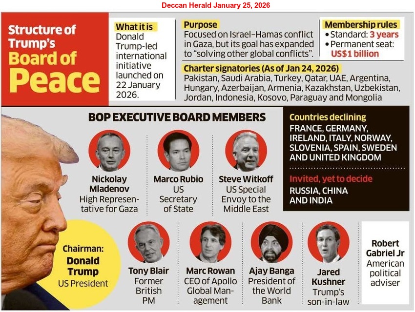 The Board of Peace (BoP), recently formed by President Trump to oversee peace and reconstruction in the Gaza Strip, too, throws a direct challenge to the UN as he wants to build an alternative institution for maintaining a different global order. Although the UN approved his plan in November 2025 by passing UN Security Council Resolution 2803, legal experts have warned that it is a breach of international law.