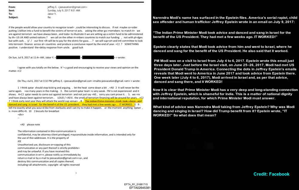 At a time when Prime Minister Modi is trying hard to establish himself as a Vishvaguru or World Leader, he has found his place in the scandalous Epstein Files. In his files, Jeffrey Edward Epstein (January 20, 1953 – August 10, 2019), an American financier, child sex offender, serial rapist and human trafficker, reportedly mentioned: “Prime Minister Modi took advice (from him) and danced and sang in Israel for the benefit of the US President. They had met a few weeks ago. IT WORKED!” Since the claim has not been established, it could have been completely ignored or denied.